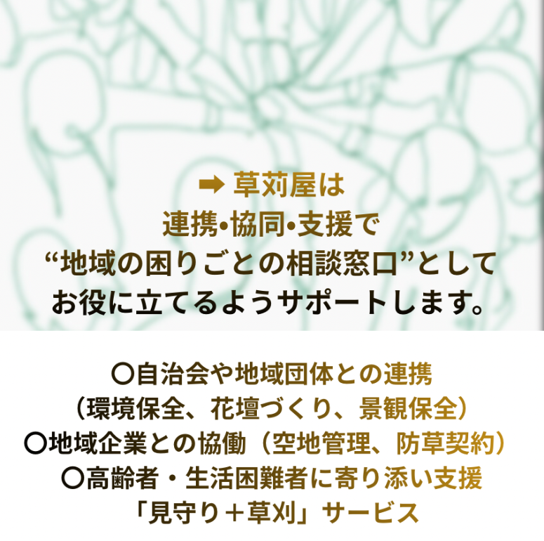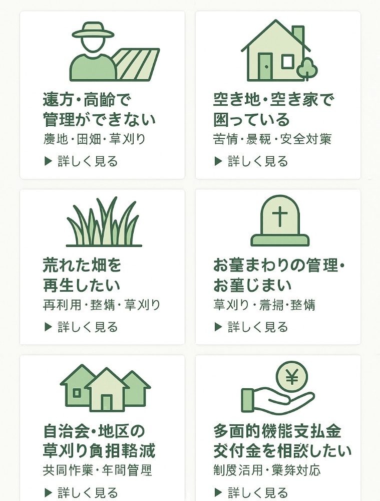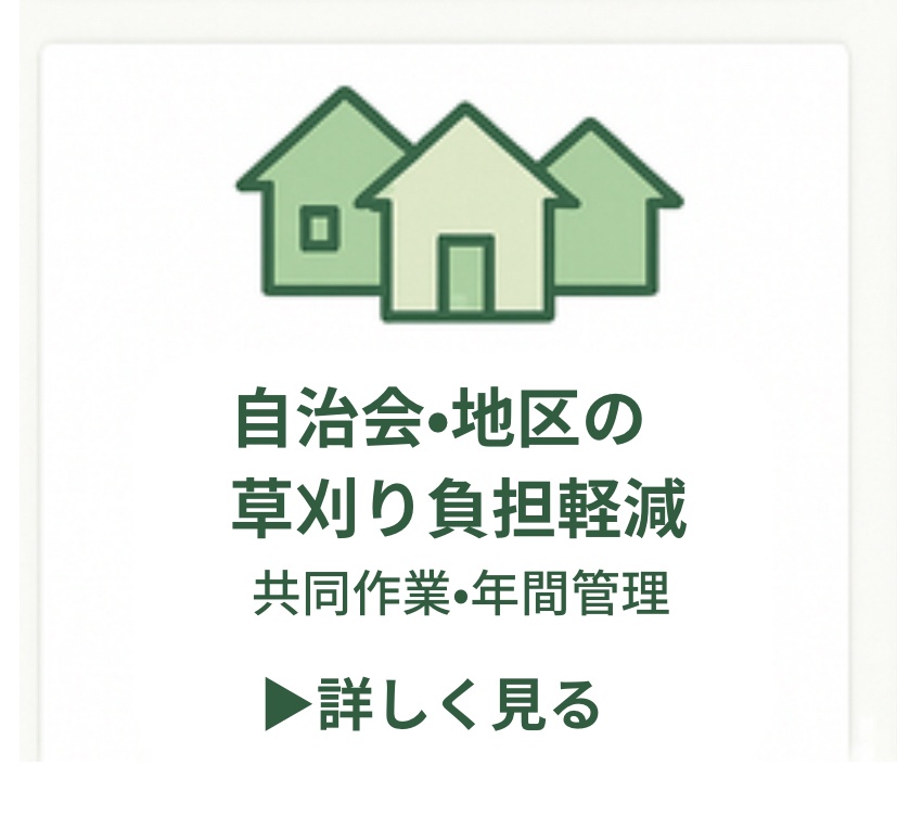 高齢化や人手不足により、地区の草刈り作業が難しくなっていませんか?草苅屋では・地区単位での作業請負・年間管理のご提案・多面的機能支払交付金の活用相談を通じて、持続可能な地域管理 をサポートします。